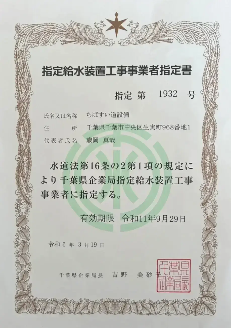ちばすい道設備は、千葉県企業局より指定を受けた正式な水道工事事業者です。