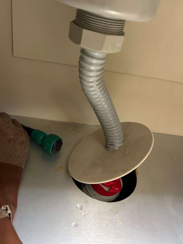まずは水漏れと逆流の根本原因である排水管の詰まりを解消するため、高圧洗浄作業を実施し、管内にこびりついた頑固な汚れを徹底的に洗い流しました。排水口から屋外の桝(マス)までスムーズに水が流れるようになったことを確認した後、劣化して水漏れの原因となっていた排水栓とジャバラホースを新品に交換いたしました。